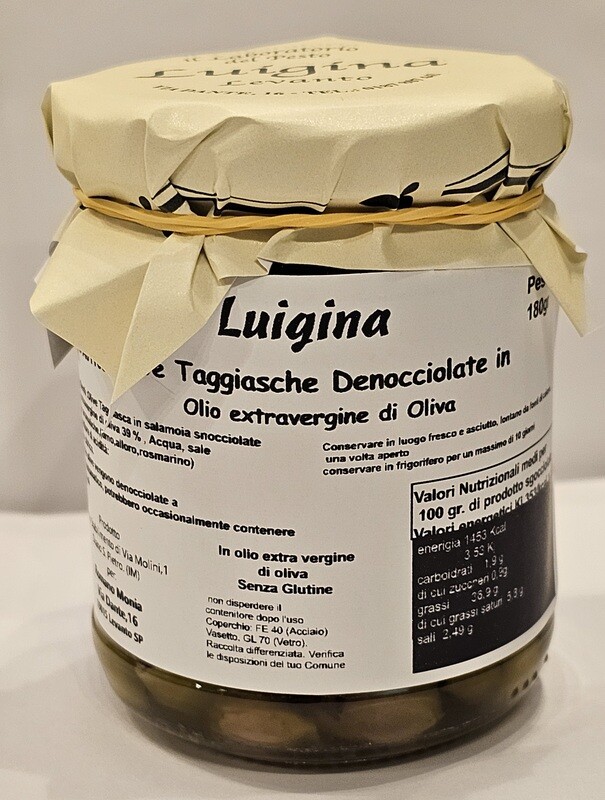 | Ingredienti : Olive taggiasche denocciolate, oilo extra vergine di oliva italiano estratto a freddo, alloro, timo, origano, sale |